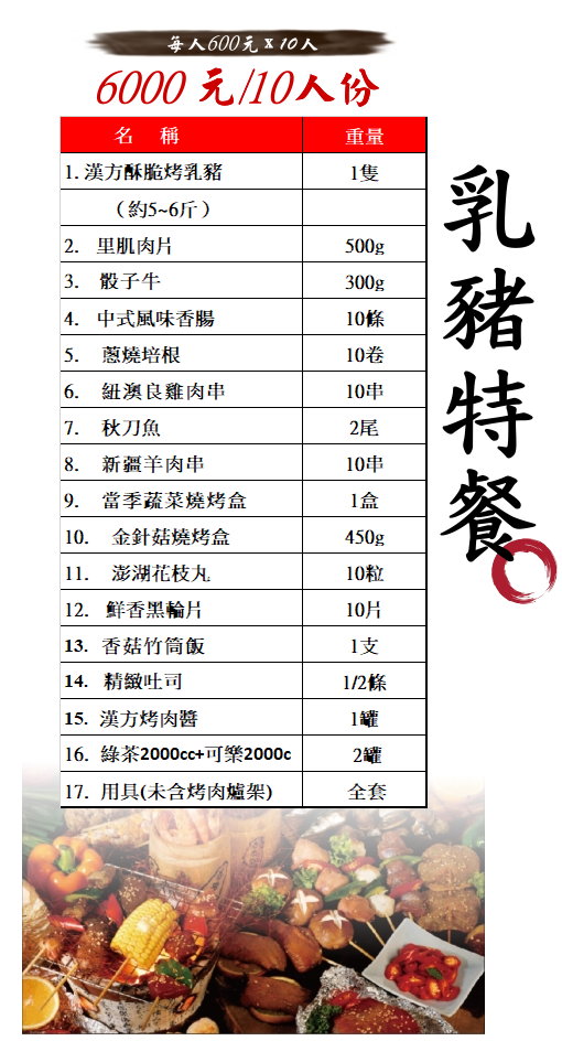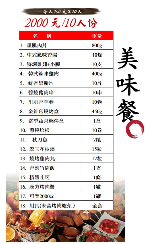 *本價目未含烤肉爐架,本公司備有多種烤肉爐架及桌椅,租或購皆可。