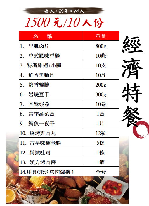 *本價目未含烤肉爐架,本公司備有多種烤肉爐架及桌椅,租或購皆可。